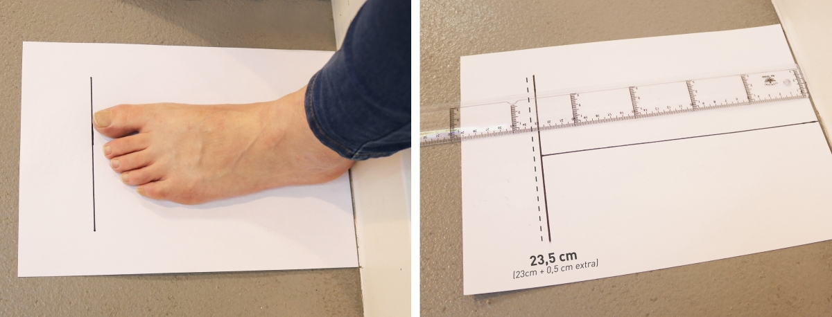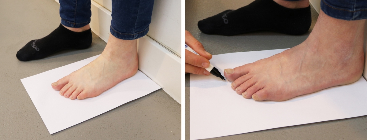 2- Pon tu pie sobre el folio, pegando el talón contra la pared. Si quieres, para que sea una medición más real, utiliza los calcetines que sueles llevar habitualmente.