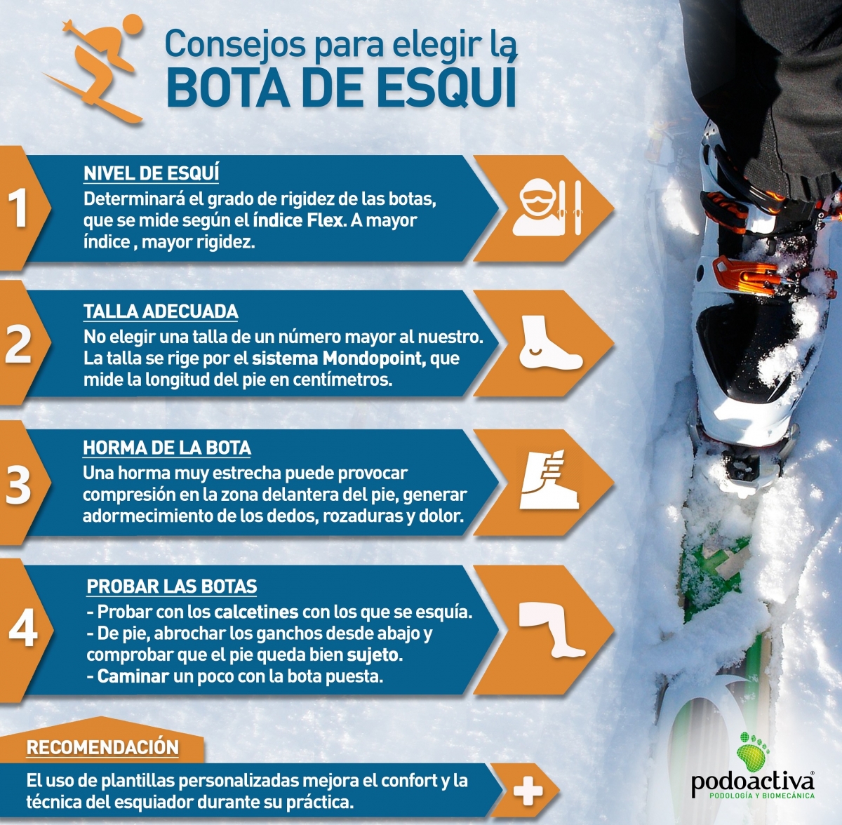 Pero el agente que más va a agredir al pie durante la práctica del esquí va a ser la bota, por lo que es de vital importancia que la elección de la misma sea correcta. Una bota excesivamente comprimida nos va a impedir disfrutar del esquí por muchos motivos (nos generará rozaduras, callosidades, nos limitará la circulación sanguínea en el pie, aumentará la tensión muscular generada en la planta del pie y en la parte posterior de la pierna, etc.). Igualmente, una bota que no sujetase correctamente el pie, nos generará problemas de inestabilidad, ampollas por fricción, etc.