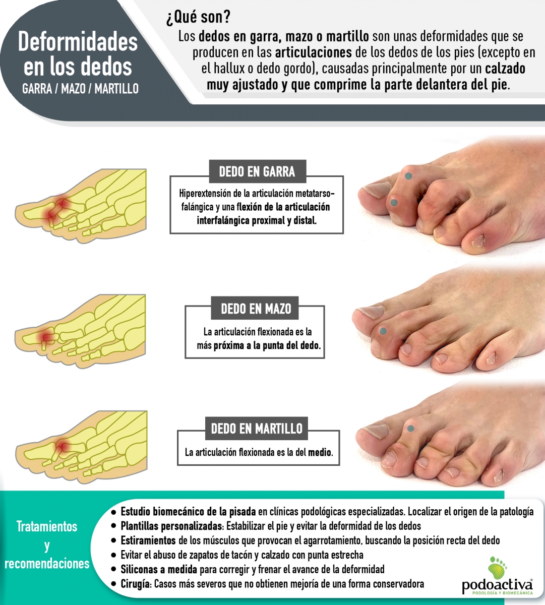 18 May 2022Los dedos en garra, mazo o martillo son unas deformidades que se producen en los dedos de los pies (excepto en el hallux o dedo gordo). Estos 4 dedos restantes están formados por 3 huesos (a diferencia de los dos huesos que forman el dedo gordo) y por varias articulaciones (que son la unión de dos huesos).