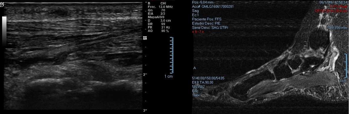 En general se pueden diagnosticar mediante la exploración clínica y una correcta anamnesis. A su vez nos apoyaremos en ecografías o RMN para visualizar la masa fusiforme, delimitar el grosor y diferenciar estructuras afectadas. A nivel de la zona dolorosa se puede apreciar una formación fusiforme de 15 mm hipoecogénica adyacente a la fascia plantar.