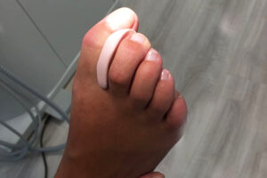 Decidimos realizar una ortesis de silicona a medida para separar el primer y segundo dedo y evitar así la hiperpresión causante del callo y dolor. Una vez decidido el tamaño y moldeada entre los dedos, sin estar catalizada del todo, pusimos el pie de gato para que acabara de adoptar la forma, endurecerse dentro del pie de gato y hacer un conjunto de pie-silicona-calzado.