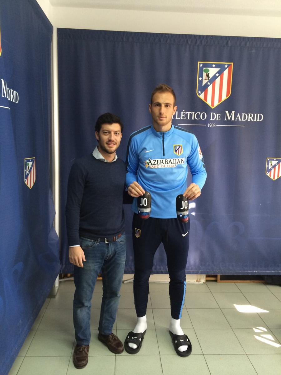 Jaime Larraz, podólogo de Podoactiva Premier y podólogo responsable de la biomecánica del Atlético de Madrid entregó sus nuevas espinilleras personalizadas al jugador.