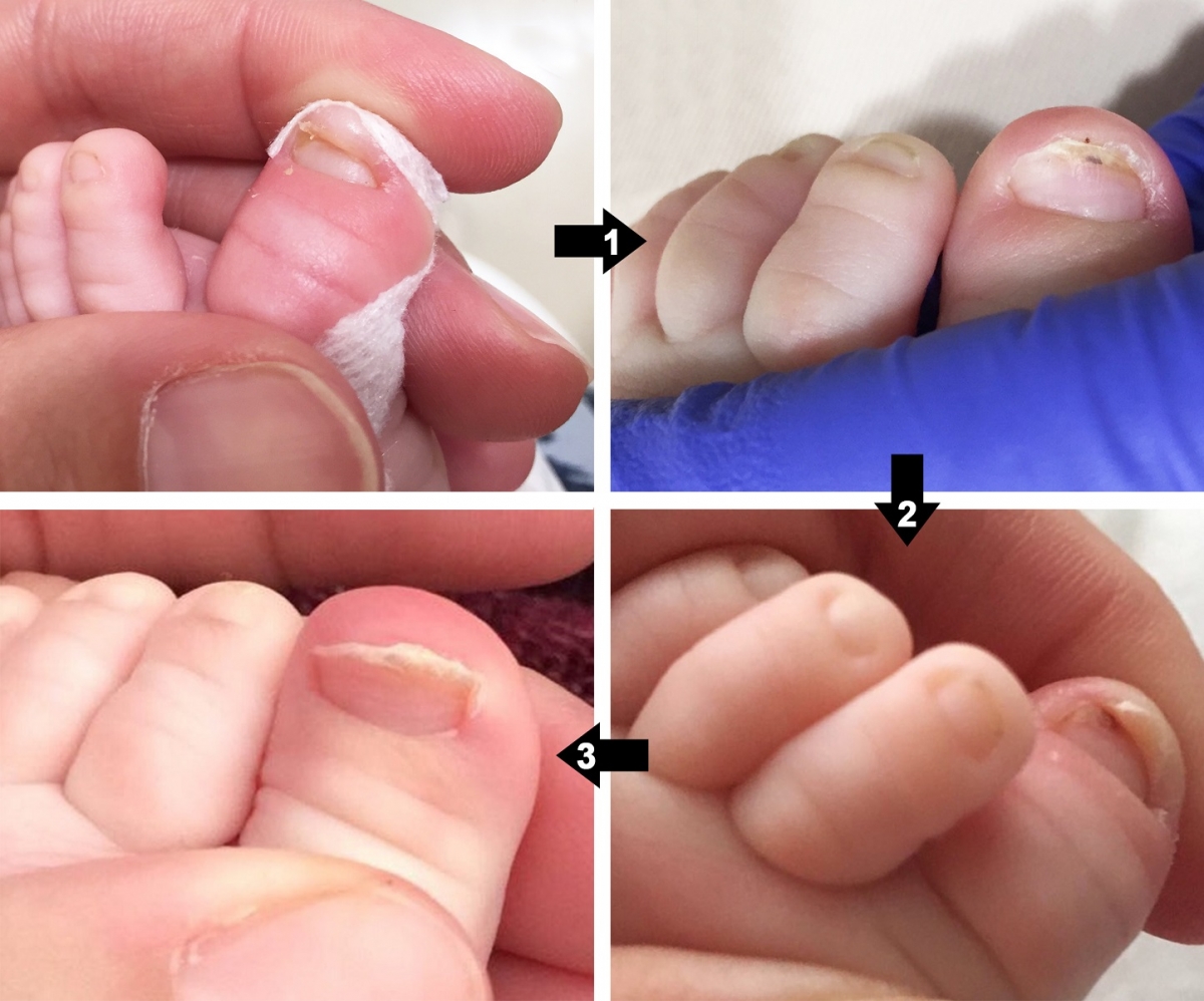 El bebé tenía desde su nacimiento las uñas del primer dedo de ambos pies más cortas de lo normal y no cubrían totalmente el lecho. Por este motivo, las uñas se incarnaron en la parte distal y provocaron una pequeña infección debido a que el extremo distal del dedo, conocido como hiponiquio, obstruía su paso.