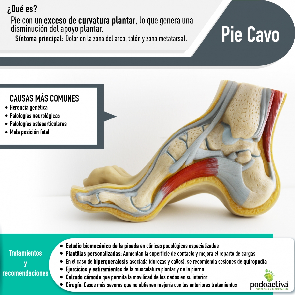 Por todo lo anterior, se hace evidente que el pie cavo tiene unas implicaciones sobre la salud. Por lo que es imprescindible que el pie cavo sea diagnosticado y tratado por el podólogo en primera instancia, combinando terapias físicas y rehabilitadoras a través del fisioterapeuta para frenar los problemas musculares asociados.