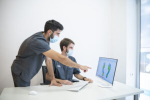 Posteriormente, con el crecimiento de la empresa incorporamos una tecnología, patentada por nuestra propia compañía, en la que los moldes pasaron a ser realizados de forma virtual. Creamos un escáner para la obtención de un molde virtual en 3D de la planta del pie del paciente. Esto nos permitía eliminar los residuos de escayola que se generaban anteriormente creando un método único a nivel mundial en la podología. Aunque el material restante se podía reciclar para otros usos, solo aprovechábamos el 2 % para la fabricación de nuestras plantillas.