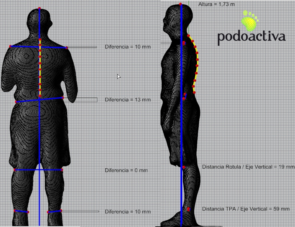 En Podoactiva® (a través de Younext® y con tecnología Microsoft®) se está ultimando el desarrollo de un software inteligente de escaneado y análisis postural en 3D, que realiza determinadas mediciones de forma automática. Las mediciones realizadas en los tres planos del espacio (frontal, sagital y axial) permiten generar un informe automático de las posibles alteraciones posturales y su repercusión en la biomecánica del sujeto analizado.La utilización es muy simple y se realiza todo el protocolo de medición en apenas 2 minutos.