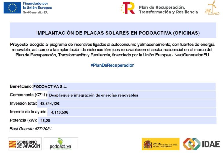 Podoactiva, ha recibido las ayudas (con el apoyo obtenido de Fondos Next Generation y el Plan de Recuperación, Transformación y Resiliencia) promovidas por IDAE (Instituto para la Diversificación y Ahorro de la Energía) para el impulso de actuaciones y proyectos de eficiencia energética y energías renovables.