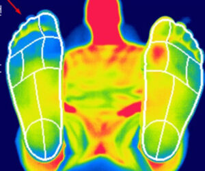 Cámara termográfica. En el pie izquierdo del paciente lleva separador de dedos, el derecho no.