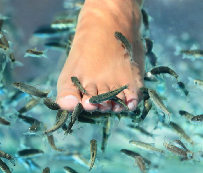 Sumergir los pies en un pequeño tanque de agua, donde unos peces llamados “Garra Rufa” limpian y exfolian las células muertas de la piel de los pies.