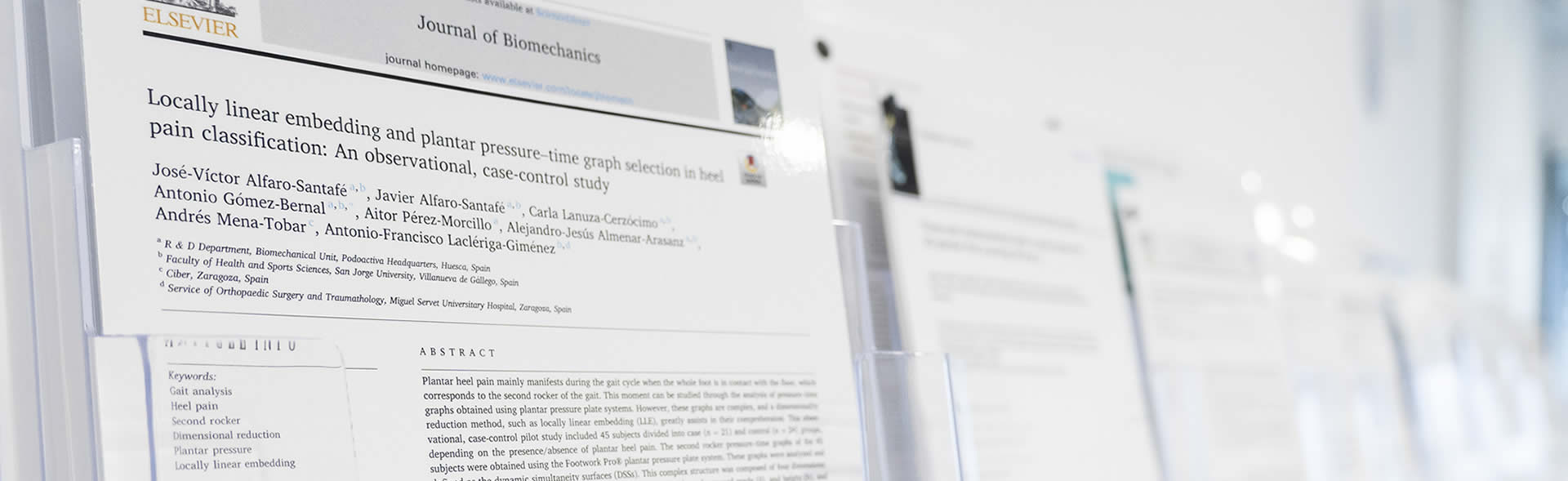 - Alfaro-Santafé JV, Alfaro-Santafé J, Lanuza-Cerzócimo C, Gómez-Bernal A, Pérez-Morcillo A, Almenar-Arasanz AJ, Mena-Tobar A, Laclériga-Giménez AF. Locally linear embedding and plantar pressure-time graph selection in heel pain classification: An observational, case-control study. J Biomech. 2021;128:110784. Disponible aquí.